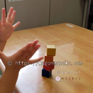 小さな積み木が4つ用意されていて、保健師さんが積み木を重ねてお手本を見せてくれました。
