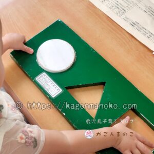 丸、三角、四角の型がくり抜かれた木版を用意され、次に入れ込むための丸の型がでてきました。