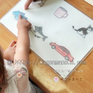 保育師さんが「これは何?」と質問すると、子どもが「クウーツッ」と答えていました。逆に、保育師さんが「車はどれ? 」と質問すると、「コレ」と指を指して答える2パターンでした。
