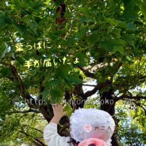 椿のスポットが終わりコースを歩き始める出だしも一番最後。そして、次のスポットに参加者がつきそうになったら、娘ちゃんがまた言うんです。「ママ!ママ!急いで。」その合図でママはまた最前列で歩けるように猛ダッシュ!!!!!!ママは娘ちゃんのために頑張って走ります。そこで撮れた写真が素敵すぎるんです。自然体験って緑に囲まれているので絵になるような背景で子どもの写真が撮れるんですよね( *´艸`)猛ダッシュした行先は、カエデの樹に到着です。木が大きくて2歳児の身長の高さまで枝が垂れ下がってきていました。