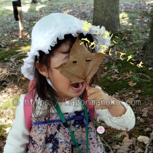 専門職員に案内されながら、山道をみんなでゾロゾロ歩いてきます。足元には落ち葉が落ちていて、娘ちゃんが歩くたびに、パリパリパリって音がしたり、枯れ枝を踏んだらパキッって鳴るんですよね。すると、2歳の娘ちゃんは「ママ!何か音がする?」って秋の音に気付いてくれる様子なんです。そしたら、職員の方が「ほら、秋の音がするね。」って娘ちゃんの質問に答えてくれるんです。