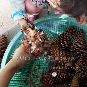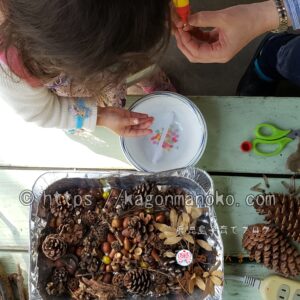 拾った木のみ以外にもビーズや絵具や紙粘土、グルーガン(糊)、ボンドなど様々な道具が用意されていました。いろんなものがあり過ぎて何を作っていいのか迷ってしまうぐらいです。そこで、娘ちゃんが興味を引きそうなものは何かな~と様子を見ていると、松ぼっくりの種がパラシュートみたいに落ちてくるのが楽しかったみたいなんです。そこで、松ぼっくりをコンコンと物に当てたり一緒に振ったりしながら種を集めて、その種を有効活用してモノづくりをすることにしました!