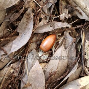 職員の方と一緒に見つけた「枯葉の中から見つけ出したどんぐり」はコレ!色味の加工をしていない写真なんですが、どんぐりが輝いています。落ち葉との色合いも最高ですね。
