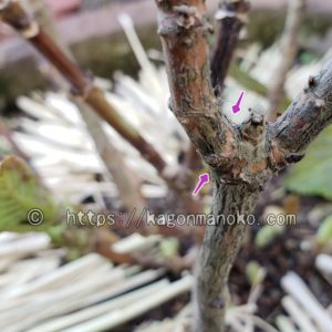 剪定する箇所を紫色の矢印で指しています。