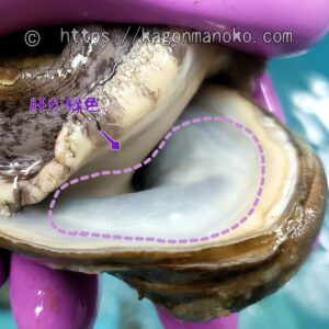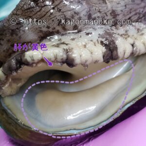 あわびの雄雌の区別が簡単に分かる方法は、肝の色なんです。緑色の肝だとメスで、黄色の肝だとオスです。