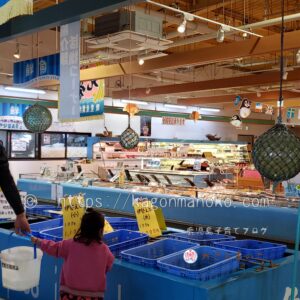 釣り堀り体験もあり、見える魚が釣れるという、子どもがテンションマックスになる体験があります。浅瀬の生け簀で簡易的な釣り竿ですが小さなこどもが遊ぶ上では危険性がないので安心して釣りを楽しむことができます。釣り竿のレンタル、餌代、連れた魚代、料理代と体験費用はかかります。釣り体験コーナーには魚だけではなくイセエビやナマコなど育てているので見学して違いを学ぶことができます。釣った魚は生きたまま物産館に持っていくと油揚げにしてくれます。
