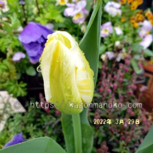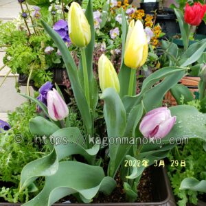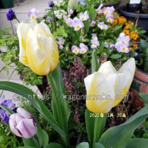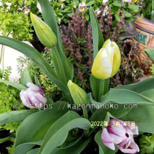 3月31日は開花2日目。チューリップの花が開き始めています。5球植えたうち開花した3本のはちみつミルクの花開きの様子を載せますね。