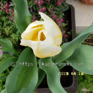 3月31日は開花2日目。チューリップの花が開き始めています。5球植えたうち開花した3本のはちみつミルクの花開きの様子を載せますね。