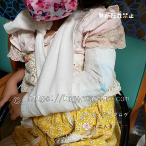 ギブスをしていると洋服の着替えは子ども一人ではできないので親が手伝ってあげます。脱ぐときは怪我をしていない腕から袖を脱ぎ、着るときは怪我をしている腕から袖を通していきます。