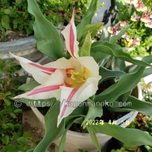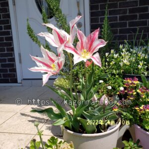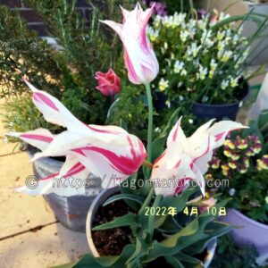 マリリンは草丈が高く40㎝ほど伸びますので、鉢植えので寄せ植えをしたら立体的な空間をつくることができます。ユリ咲きチューリップは他のチューリップと比較すると開花したら大きな開きをするので迫力がありイイ感じですね。