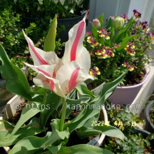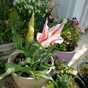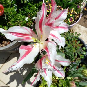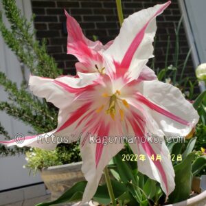 マリリン初開花です。商品パッケージには開花4月~5月と記載がありましたが、4月上旬に開花しました。白色の花弁に赤色の筋が入った大きくスレンダーな花弁が上品です。各花弁に赤色の筋が1本ずつですが、咲き進み開花日数が経つにつれて模様が広がってきます。