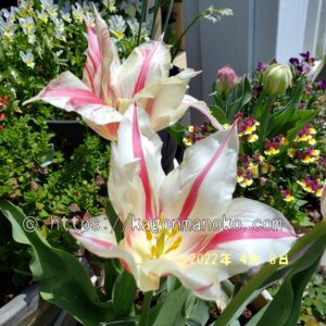 ユリ咲きチューリップは他にも多くの種類があるので、花色や咲く時期、草丈、咲き方など育てたい品種が見つかるといいですね。マリリンが咲く同時期に、フリンジ咲きのチューリップであるクミンズが咲いていました。