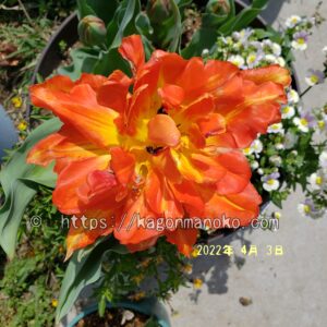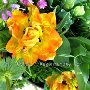 モンテオレンジが開花した数日後から赤色の八重咲きチューリップであるフラッシュポイントが開花しました。一緒に育てて花瓶に飾ること、いっそう華やかなチューリップを観賞することができます。