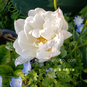 チューリップと思えない花型です。天気がよいので太陽に向かって花びらを大きく開かせています。ネモフィラの薄い水色の花と寄せ植えをしていますが、同じ背丈でツーショットが撮れました。