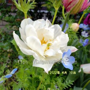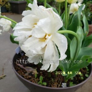開花5日目になると開花始めのピンク色が完全に抜けて、真っ白な花びらになります。本日は雨時々曇りなので、天気の良い日と比べると花が閉じています。黄色の花粉が見えないほど花弁が重なっています。八重咲きが好きな方には、外せないチューリップの可愛らしさが味わる一面ですね。