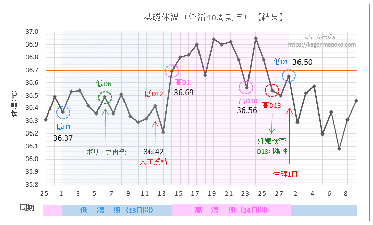 生理予定日前から妊娠検査薬が「陰性」の中、生理予定日を越えても高温期をキープしたままでした。高温期が続いても陰性でした。しかし、生理予定日(D27)から5日目に生理がきたという結果になってしまいました。