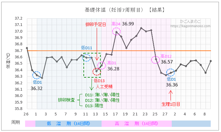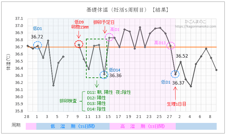 さらに基礎体温の変化から、排卵予定日は基礎体温がぐっと下がることや翌日から高温期36.7℃以上になっている結果から、排卵はD14~15あたりだったのではと推測できます。
