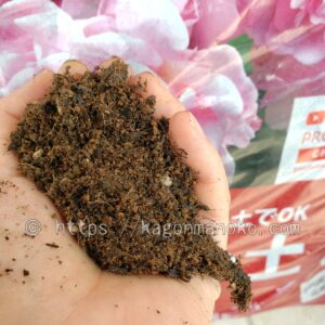 公開している原材料は、赤玉土(小粒)、牛ふん、もみがらたい肥、馬ふんたい肥、くん炭、そば殻たい肥で、その他は極秘資材となっています。腐葉土は一切使用していないようです。