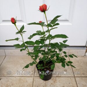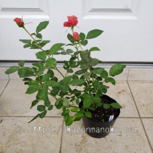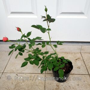 (考察)同じ培養土を使って同じ環境下で育てているのに、スリット鉢で育てた薔薇は開花は1つだけで葉の枚数も少ないですが、大きな花を咲かせていることや葉1枚が大きいこと、苗が横たわらずに木立性を保っていました。イイ感じですね。