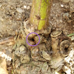 原因は、カミキリムシの幼虫であるテッポウムシが幹を食べているからです。