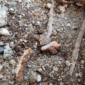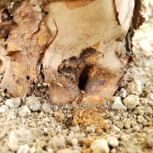 バラの根元におがくず(木屑)を見つけた時に、初めてバラが被害に遭っていると気づきます。8月中旬が過ぎたころ、バラの根元に木屑が盛り上がっています。