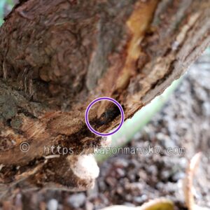 穴が大きいので、もしかして成虫になって飛びだってしまったのかなと思いつつ、念のために穴から殺虫剤を吹きかけました。