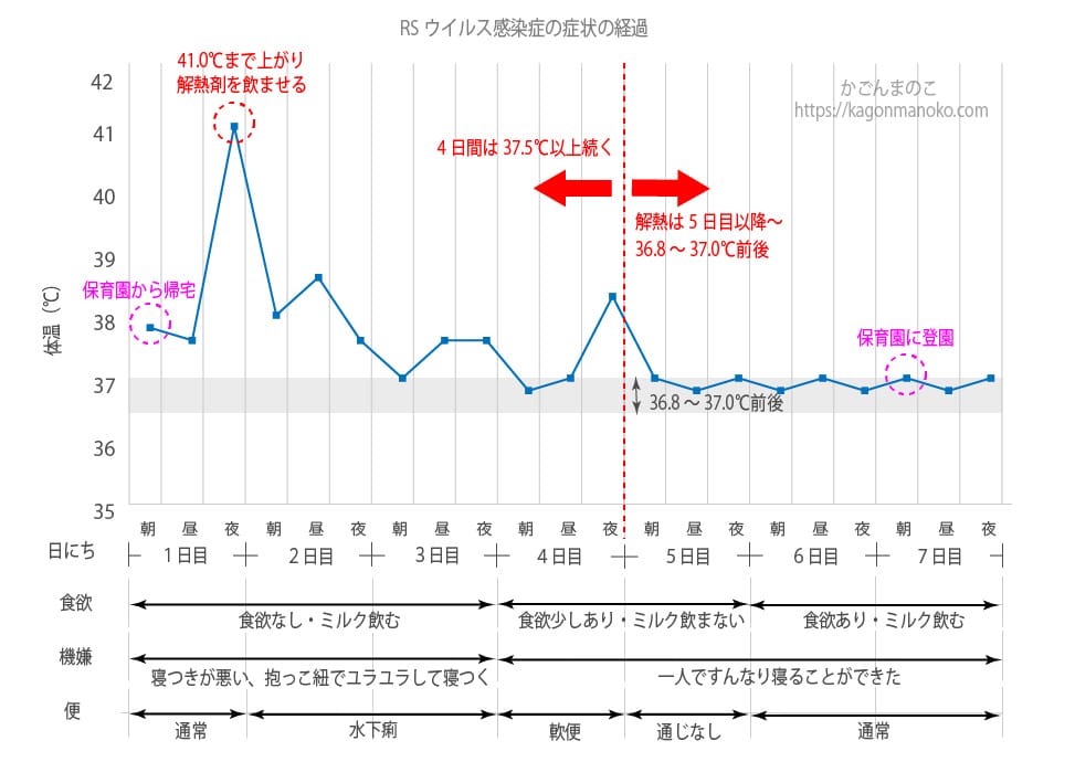 RSウイルス感染症にかかった子どもの体調変化をまとめるとこんな感じになりました。