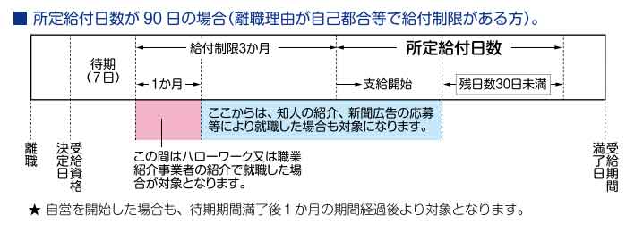 退職(≒離職)理由が自己都合等の場合は給付制限があるので、ハローワーク経由以外で就職すると再就職手当が受給できない時期があります。下の図で解説すると、ピンク色で塗りつぶされている「1ヶ月:この間はハローワーク又は職業紹介事業者の紹介で就職した場合が対象となります。」と書いている期間のこと。