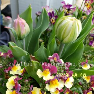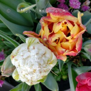 他のチューリップと寄せ植えをしたスノークリスタルの様子です。
