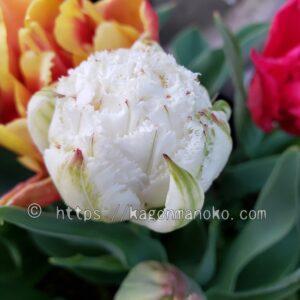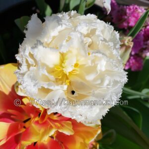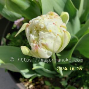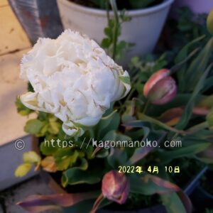 同じフリンジ咲き&八重咲きのチューリップと寄せ植えをしていたスノークリスタル1球。4月上旬につぼみが膨らんできましたが、なかなか咲いてくれなかったんです。