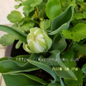 白咲きのチューリップは、全体的に淡いグリーン色をしています。3月下旬、一番最初に見つけた蕾をご紹介します。葉っぱはとても元気で蕾の時から清潔感がありあっさりとした印象を感じます。