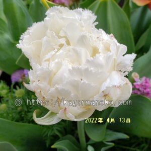 スノークリスタルの花開き。夕方に撮影しました。純白の花色が目立っていてキレイです。フリンジ咲きの八重咲きの特徴を持つチューリップの違った一面を見ることができました。八重咲きはボリュームがあってチューリップとはいえない植物みたいです。面白みがありますね。この時、草丈は約30㎝。