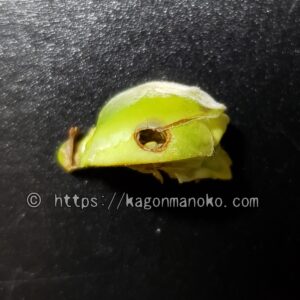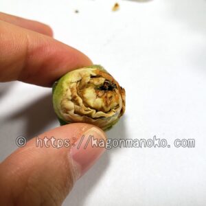結局、幼虫を見つけることはできませんでした。また、蕾の奥深くまで食害の被害が進行していませんでした。蕾に空いた穴は幼虫が入ってきた侵入孔なのか、それとも育って外に出て行った排出孔なのか分からない結果となりました。