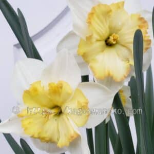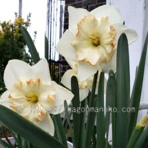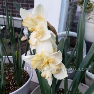 カメラ目線ではない一番左側の水仙が開花5日目です。これはこれで優しく上品な印象を受けますね。