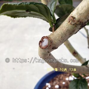剪定2~3カ月後の樹木の状態をお伝えします。トップジンM(防腐剤・殺菌剤)を塗ったことや適切な切り方により、大きな幹を枯らすことなく剪定切り口の少し上に出ている葉も枯れることなく生きています。3か月後には蕾が肥大化し開花しました。