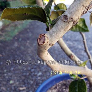 花芽形成期に、確実に花芽が形成され順調に育っていた椿は7月中旬~下旬に、葉がなくなってしまい茶色の1本の枝が不自然に目立っていました。
