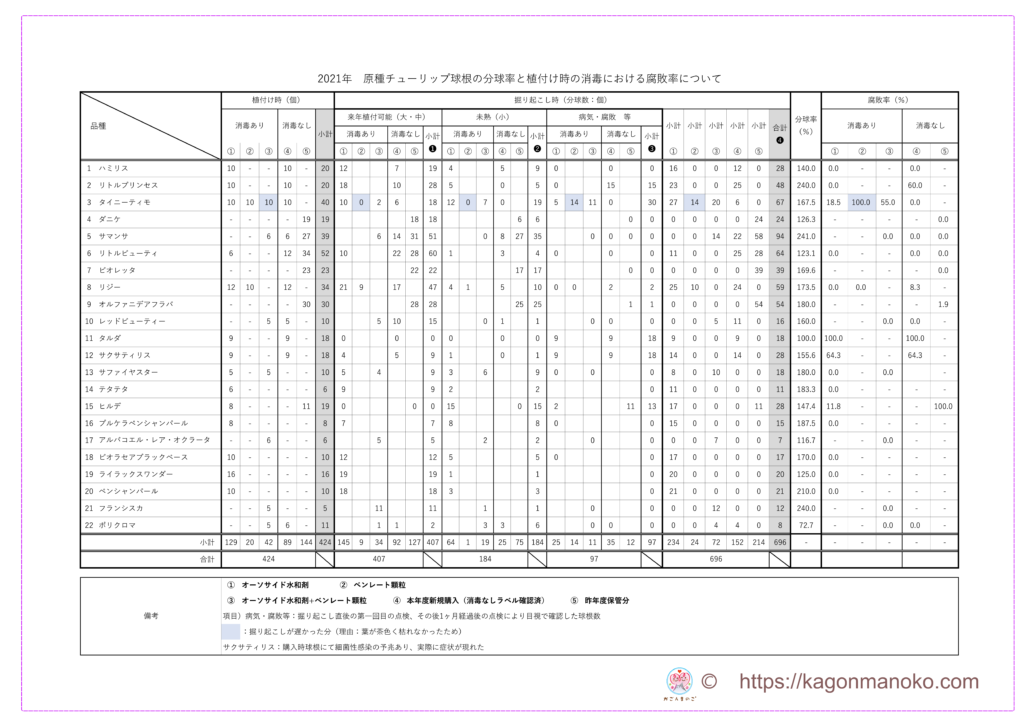 (解説)これは5月に掘り上げた時に子球根が取れた個数や割合、一方で腐敗率を占めています。消毒有り無しの項目があるけど、単純に分球率を見てくださいね。22品種育てたうち「11.ポリクロマ」を除いて21品種が100%以上の分球率です。つまり、いろんな品種を植えても95%の確率で、平均164.1%の子球根を取ることが出てきています。もちろん、掘り上げ時期を早めたことだけが要因ではありません。育てた用土や育て方にも比例していきます。