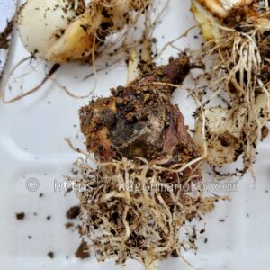掘り上げた後に水洗いをした球根をさらに消毒もしないで放置しました。球根にとっては一番、置かれている環境が悪いですね。そんな状態で正常に球根が保存できるのか調べてみます。ということで、掘り上げから約1ヶ月経った球根がこちら。
