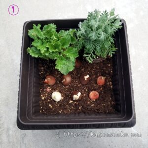 球根は置く向きによって葉の出具合が変わってきます。鉢の内側部から外に向かって、球根のぷっくら膨らんだ方を内側にし、平たいでへこんだ方を外側になる植え付けをすると葉がでた時の見た目がよいです。平らでへこんだ方に一枚目の大きな葉がでてきます。大きな葉の向きを揃えることで、葉が重なり合うことなく、生育に必要な日光が葉に均等に当たる良い効果もあります。