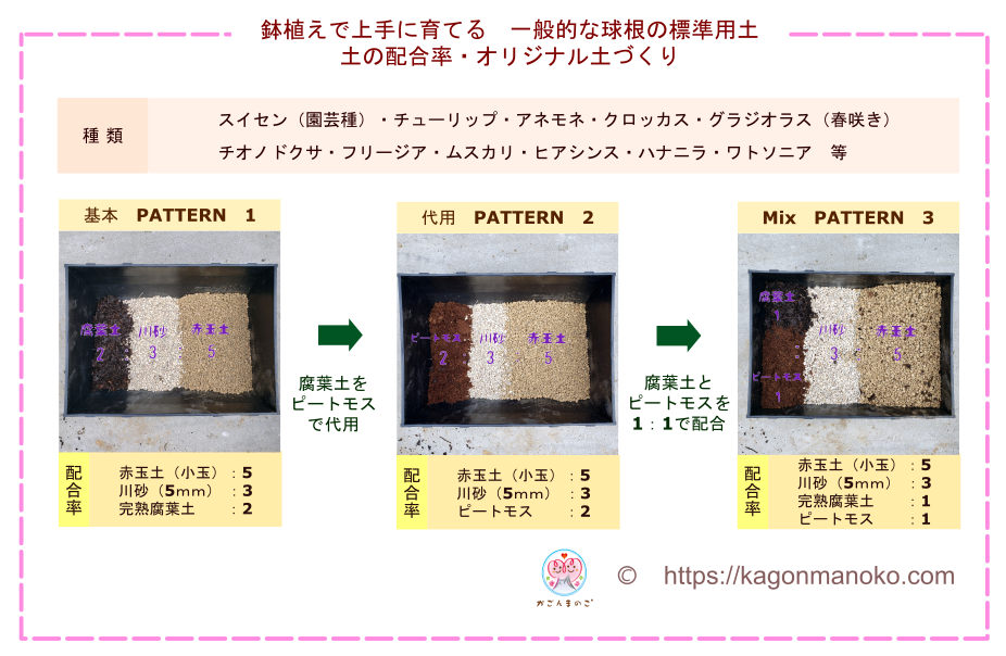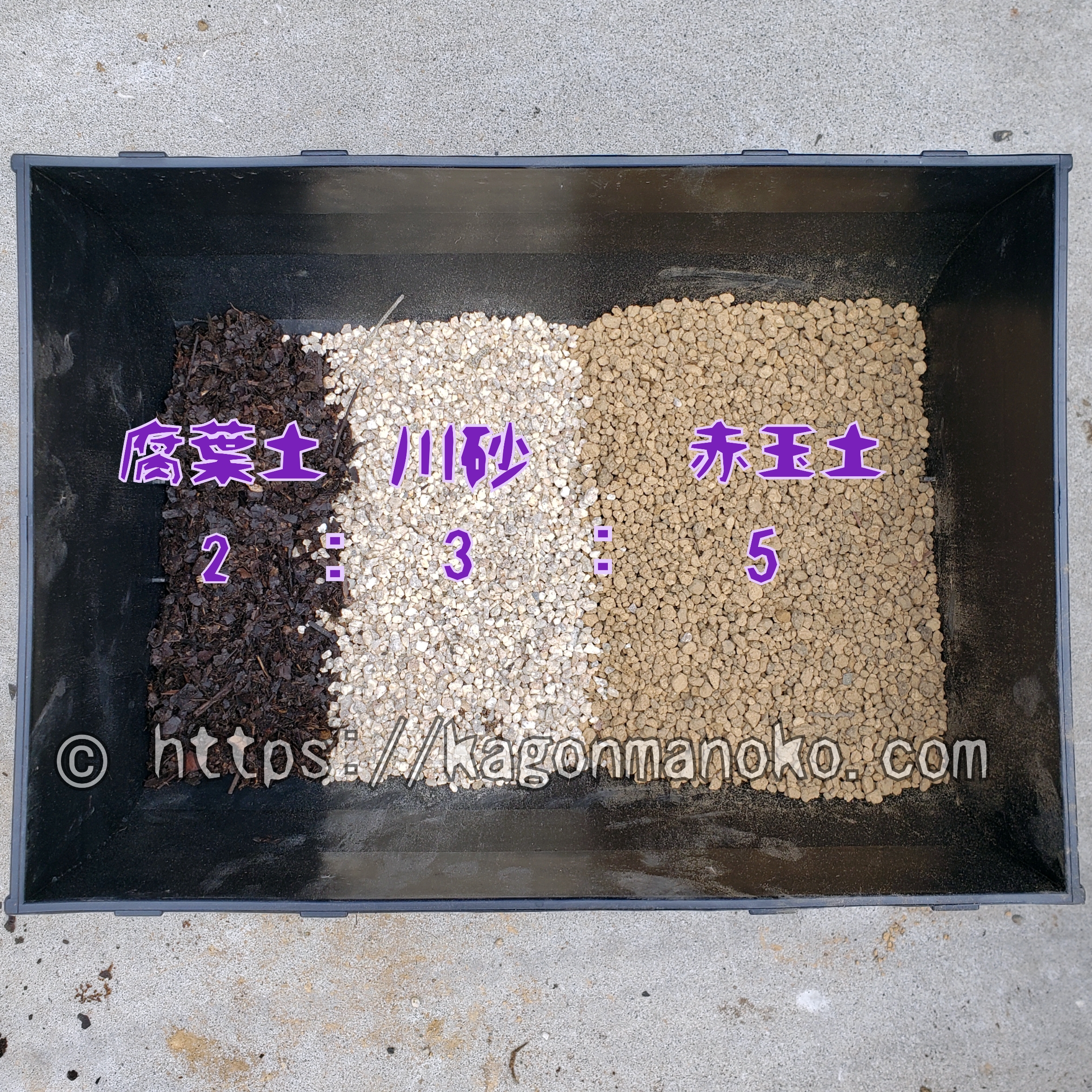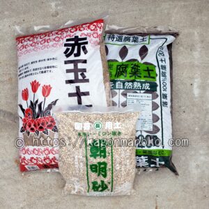 購入した土は3種類 一般的な球根の配合率は、赤玉土(小粒):川砂:腐葉土=5:3:2がよいとされています。肥料の効き目や適度な排水性・保水性に優れている配合率です。 fa-check-square-o赤玉土(小粒) 5 *腐葉土の入手が難しい時は、酸度調整済みのピートモスを代用しています。 土づくりは、赤玉土基準の配合をすれば球根を傷めず失敗しないです。アレンジしてオリジナル土を作っても楽しいですね。