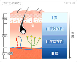 やけどの症状は、皮膚が損傷を受けた深さ(深度)や広さ(面積)で変わります。見た目では軽く見えても、皮膚の奥まで損傷していることもあるので注意しましょう。皮膚の損傷を受けた深さによってI~III度に区分されます。